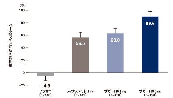 プロペシア(フィナステリド)1mgに比べてザガーロ0.5mgは毛髪数が約1.6倍増えています。